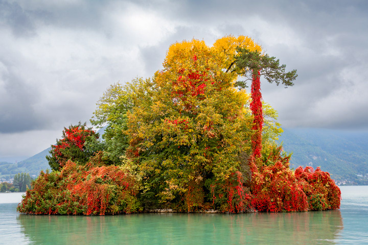 Îlot d'arbres de couleurs au Lac d'Annecy. France.